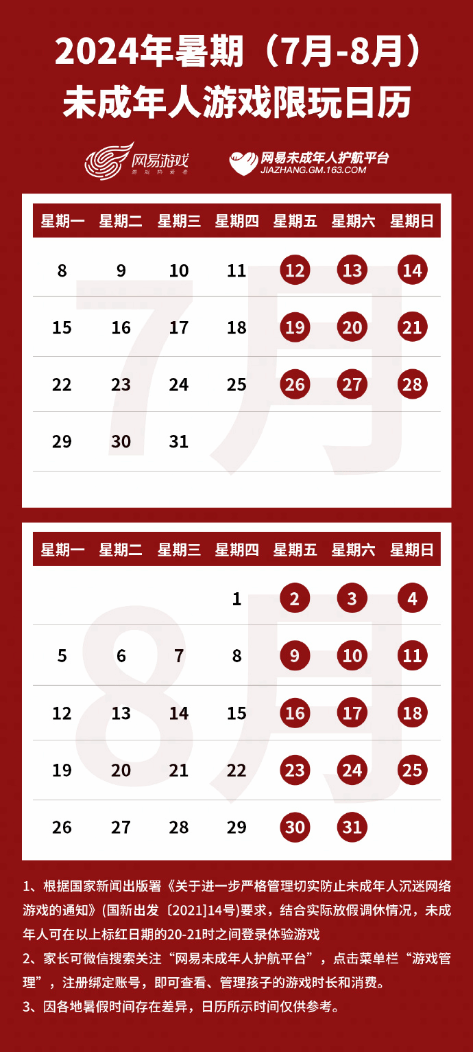 网易发布未成年人暑期游戏限玩日历总时长不到24小时。今天网易公布了未成年人暑期游戏限玩的公告,从7月8日开始到8月31日,看得出来网易作为大厂还是有担当的。