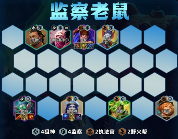 监察老鼠是金铲铲之战中一套以图奇为主C,搭配监察前排+狙击后排的阵容。其核心打法是利用羊刀叠攻速,搭配狙神转职,轻松秒杀敌方后排。该阵容在JOC7比赛中经常出现,成型后强度极高,适合追求稳健上分的玩家。接下来小编将与各位介绍金铲铲之战监察老鼠阵容的构筑玩法,希望对你有帮助。