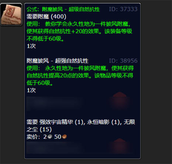 成功学习该图纸后,附魔披风 - 超强自然抗性所需材料如下: