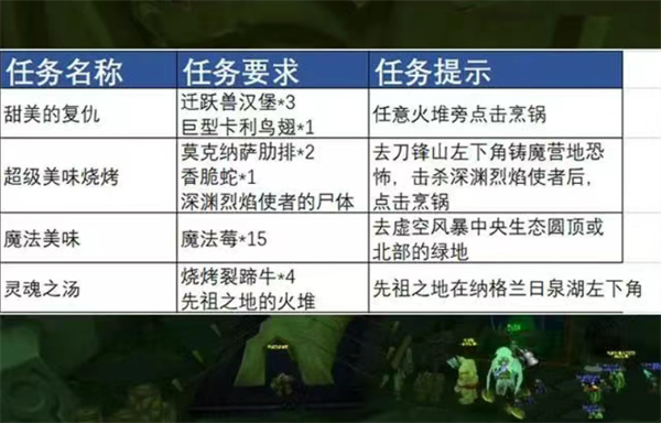 其余3个任务需使用特定食材进行烹饪(技能325+可自行制作,也可拍卖行购买)