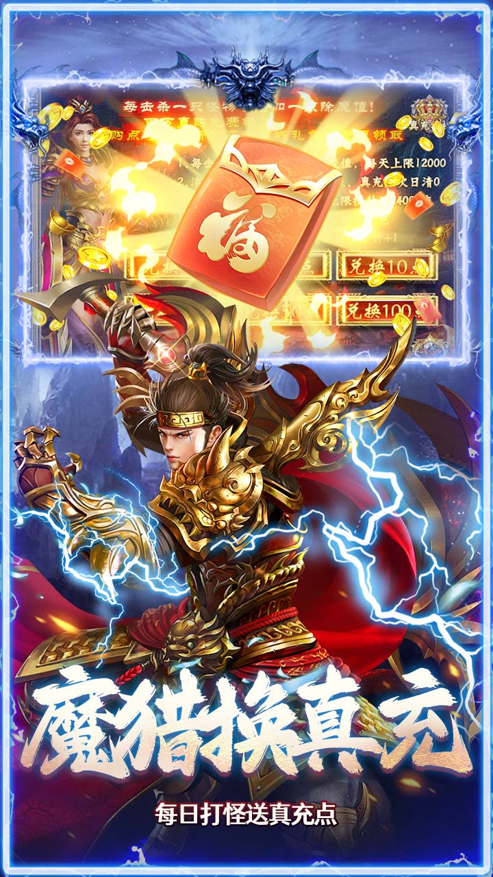 充值比例1元:100元宝 ★送充值卡:每天登录游戏送648充值卡 ★开局福利:开局送职业武器,开荒装备,开荒元宝,职业流派技能书 ★开局特权:开局送刀刀绿毒,自动拾取,范围拾取 ★百万真充:魔猎兑换真充值点,免费兑换游戏道具、时装、称号 ★超高爆率:所有道具全靠打,小怪也能爆神装 ★其他福利:七天登陆送“猛龙出江”限定时装 ★九流派系:三职业九流派探索更多玩法